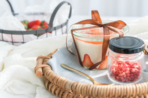 把盖子盖上,打个蝴蝶结,把冻干草莓粒装入小袋中,就可以带出去送朋友或者野餐了!