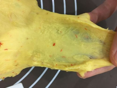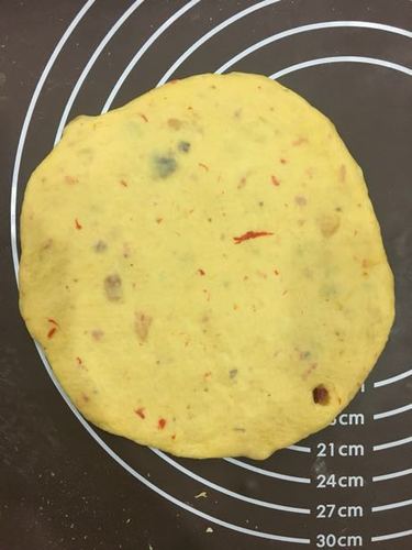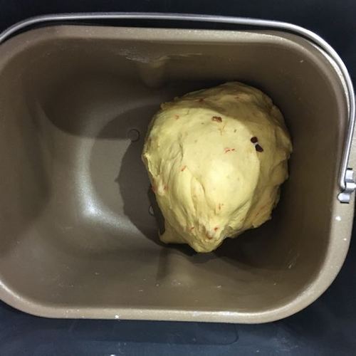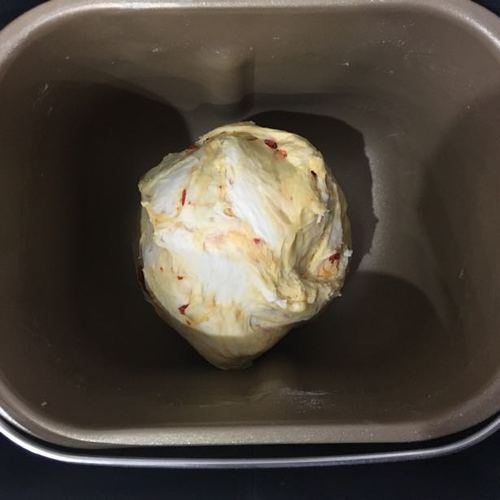 把所有材料放入面包桶内,选择和面程序.等到面团能揉出厚的膜,加入15g黄油.待黄油完全揉进面团后,再加入滤干水分的枸杞.最后加入果干,揉至扩展阶段,能出薄膜结束揉面.