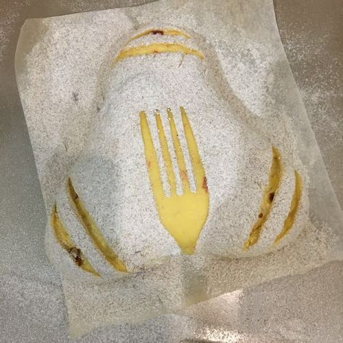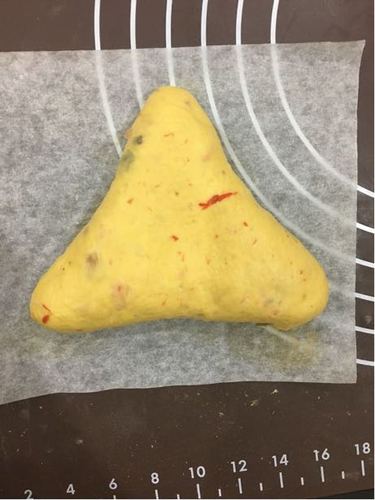 松弛结束.把面团用擀面杖擀成圆形.然后捏出三个角,成三角形面团.还有滚圆成圆形面团.进烤箱38度二次发酵.疯发酵至1.5倍大后_在发酵好的面团上筛上一层黑麦粉.再用割包刀画出花纹.