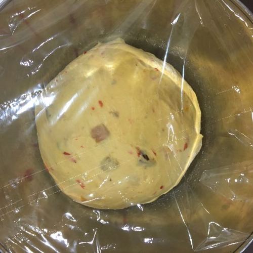 取出面团,滚圆.放进干净的大碗里,盖上保鲜膜进烤箱里28度第一次发酵.