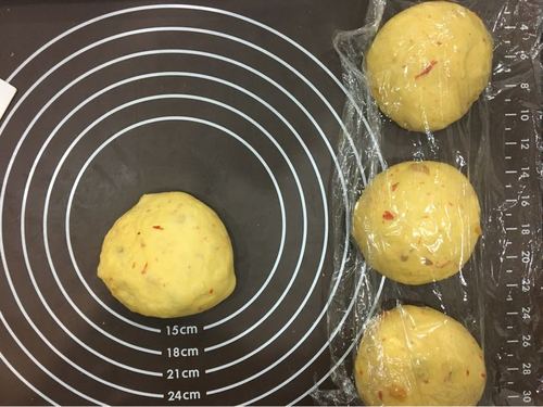 把面团取出滚圆,排气,平均分成4等份的小面团.盖上保鲜膜松弛10分钟.