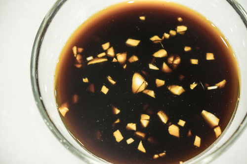 制作酱料:把蒜头剁成泥,加入一大勺生抽,少许蚝油,盐,一勺水,一勺生粉,少许油;
