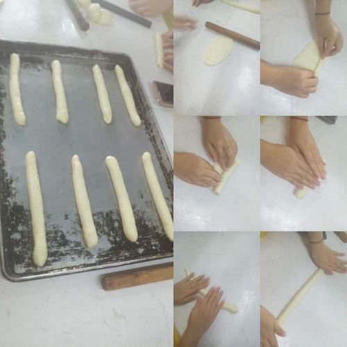 面团稍微擀长,光滑面朝下,往回卷收,收口,从中间往两边搓长,放入烤盘发酵两个小时
