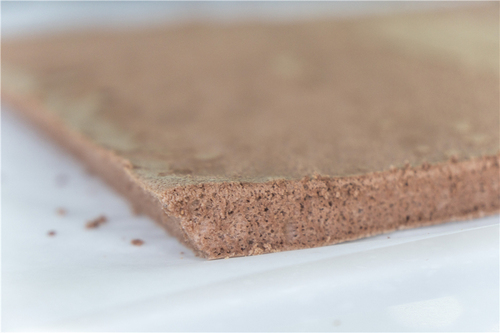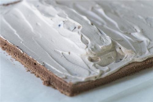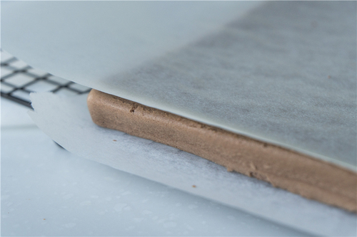 烤好后取出晾凉,待蛋糕片四周与金盘分离后,倒扣在铺好油纸的晾网上,揭下蛋糕体上粘着的油纸后,再加盖一层油纸等待完全晾凉;