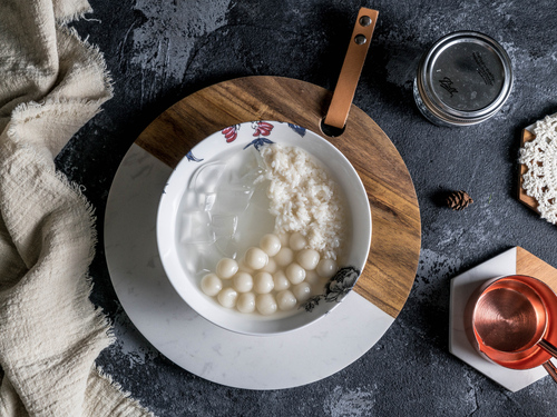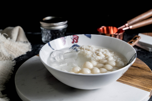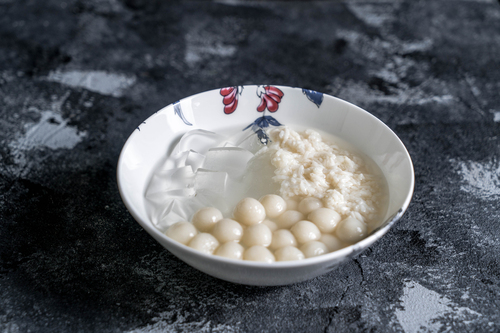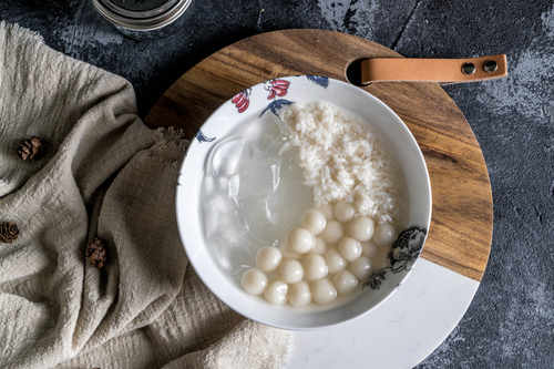 将白凉粉、小圆子、还有酒酿一起装入碗中就完成凉粉三拼啦。开吃!