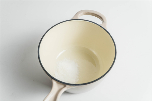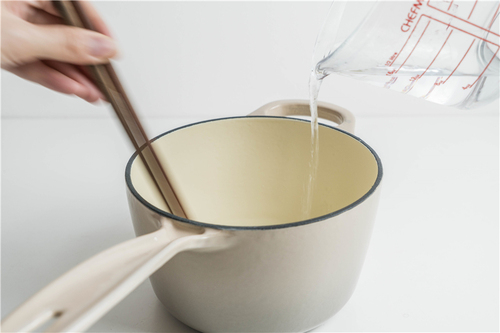 凉粉放入锅中,倒入纯净水A搅拌均匀;烧开纯净水B,冲入泡水的凉粉中,边倒边搅拌均匀,使凉粉充分受热均匀化开,之后可以再适当边搅拌边小火加热;