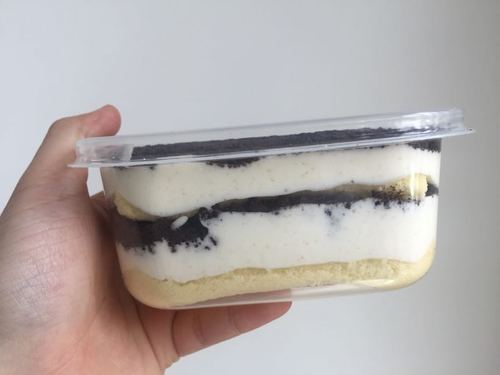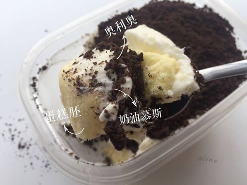 先铺一层蛋糕胚,然后放一层奶油慕斯,再来一层奥利奥碎