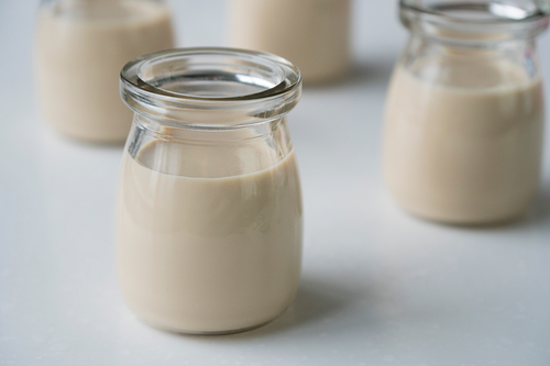 大碗中加入全蛋、蛋黄、牛奶、淡奶油,取20g凉透的黑糖浆,搅匀后倒入布丁杯中,约7分满;