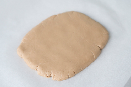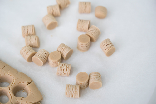 烤布丁的同时开始做粉圆:取20g黑糖浆,用30-35g热水兑开,晾凉至温热(60-70℃),撞入糯米粉中,用刮刀拌匀后上手揉成团,夹在两张油纸中间擀成7mm厚的薄片,再用大小合适的圆嘴裱花嘴或吸管扣成小粒粒,再用掌心稍稍滚圆;