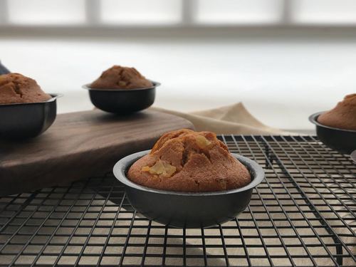 模具装面糊7分满,中间撒一撮芝士碎,面上加海苔碎。大概每个模具48克面糊,6克芝士碎。入炉后调低烤箱温度至180度,烤箱门开一条小缝,烤18-20分钟即可。