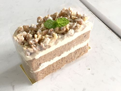蛋糕胚切成(3×9)的长方形,底托上放一层原味蛋糕胚,挤上奶油,再放一层咖啡蛋糕胚,挤上奶油,围上围边,在上面撒上满满的核桃碎。