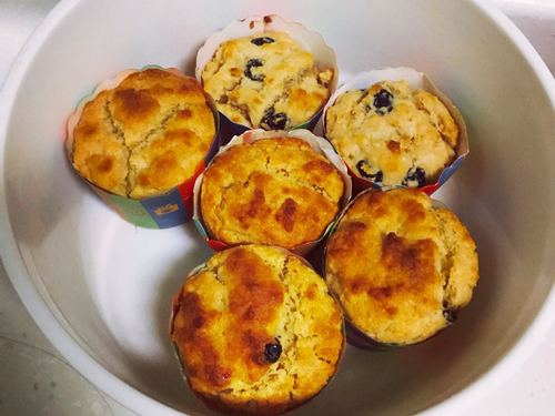 低筋面粉100g,泡打粉3g,加入黄油糊,搅拌到无干粉,加入葡萄干20g(无所谓颗粒状,随意搅拌即可)。