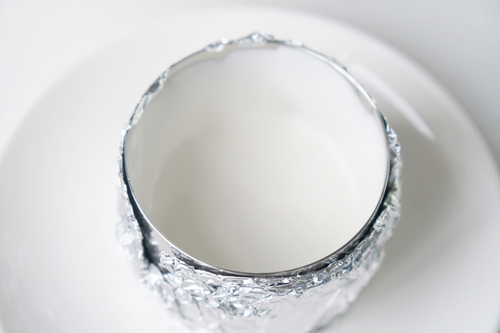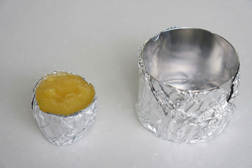 菠萝酱煮好后,用勺子装进大小合适(直径不超过你使用的慕斯圈直径的1/2)的模具里,冷冻1小时至硬(后面做夹心用),建议使用脱模方便的模具,如果没有合适的模具,也可以直接将锡纸对折后捏成大小合适的小杯子,冻好后直接撕掉。同时把要用来装慕斯糊的慕斯圈用锡纸包起来;