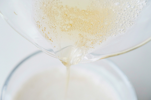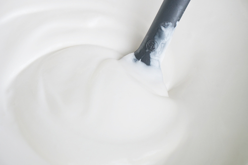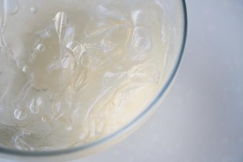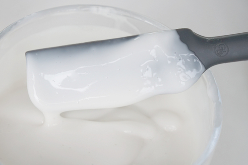 吉利丁隔热水融化,加入椰浆中,搅匀,然后坐冰水搅拌直到稍微变稠,过程大概需要3到5分钟。此时椰浆的状态应该跟浆糊差不多,刮刀搅拌时能留下痕迹并逐渐消失。如果太稠了,就隔热水融化一下再继续;