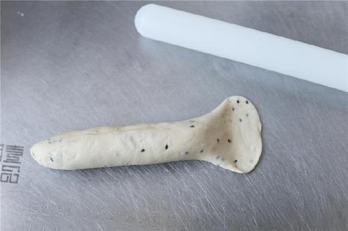 将面团一端按扁,用擀面杖擀开;然后将另一端的顶部放在擀扁的一端上,将它包住,捏紧;