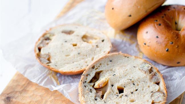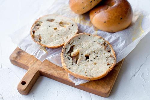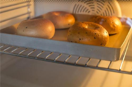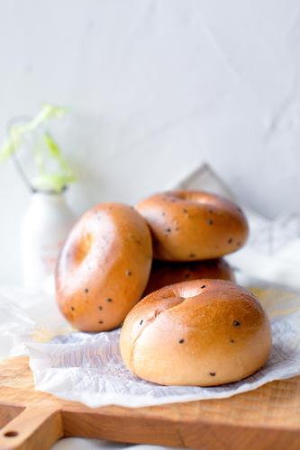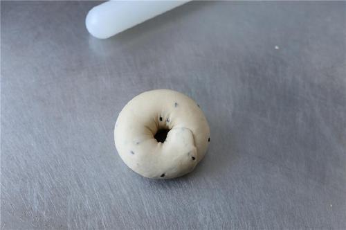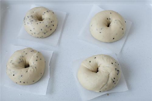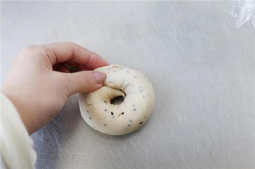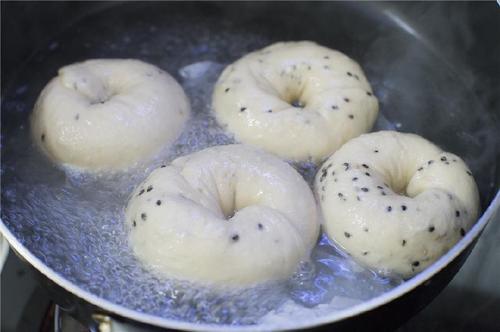 再将贝果糖水的材料倒入锅中,烧开后转中小火,放入发酵好的贝果,一面煮30秒再翻面煮30秒。