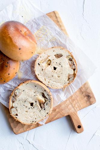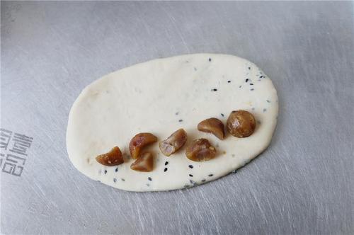 取一小份面团按扁,擀成长椭圆形;(可以按自己喜好加一些蜜豆或者焙烤过的核桃仁灯,我放的是栗子。注意两端不要放馅料)