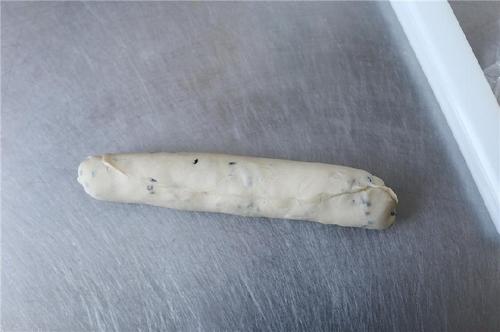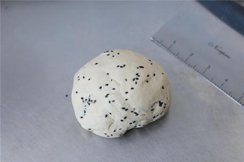 将揉好的面团切分成四等份,按扁后在每一小份面团上都撒上适量黑芝麻,再揉匀最后全部揉在一块成为一个大面团,这样揉进去的芝麻粒会比较快速揉匀又不破坏它的完整性;