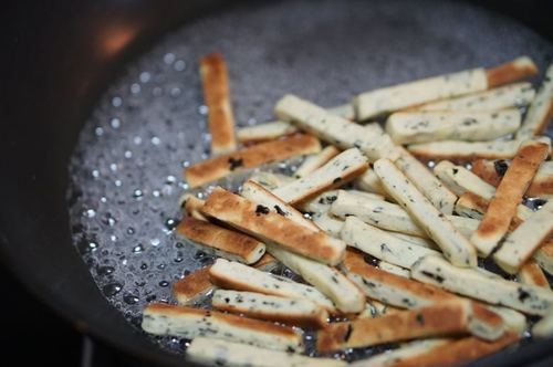 让糖浆均匀裹在饼干条上,继续翻炒直到饼干条表面出现糖的结晶