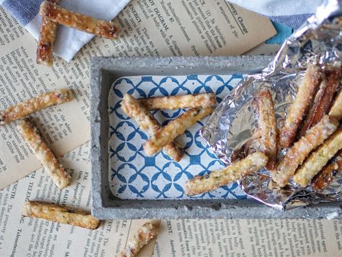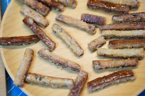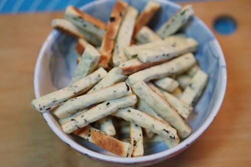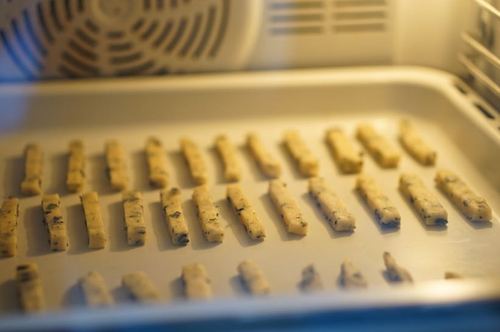 将面团擀开成约0.3-0.4mm左右厚的面皮,将面皮切成约0.5mmx4cm的细条摆在烤盘上,放入预热好的烤箱中烘烤10分钟左右,根据切的大小不同调整时间