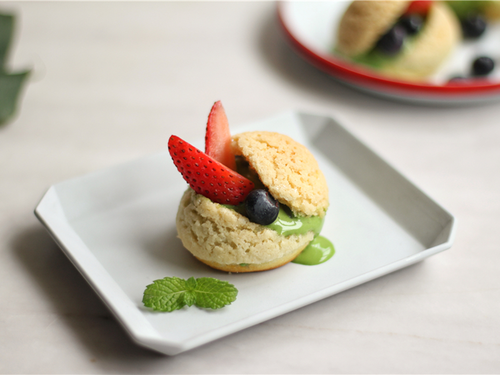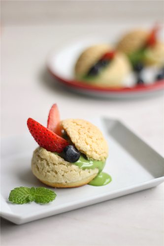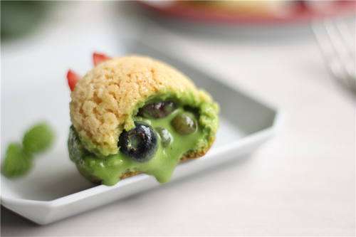 将泡芙从顶部斜切到底部切开,最底部不切断,然后用两把勺子挖出大小合适的冰淇淋球,将冰淇淋球放入泡芙内部的空洞,摆上水果,趁冰淇淋化掉之前吃!