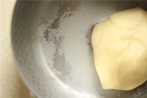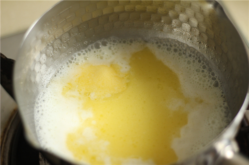 不锈钢锅中加入水、牛奶、黄油、糖粉、盐,小火煮至黄油完全融化,沸腾后马上离火;