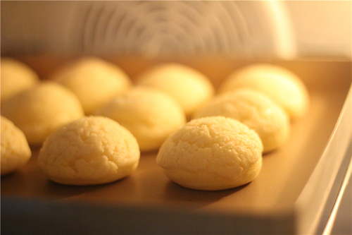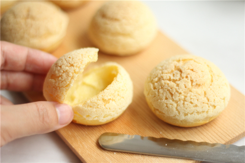 将泡芙放入预热好的烤箱内170度烤25-30分钟,最后5分钟注意观察,要烤到酥皮都完全上色就可以了,中途不要打开烤箱门,避免泡芙还没烤熟就塌陷。烤好的泡芙膨胀均匀,内部的空洞很大。