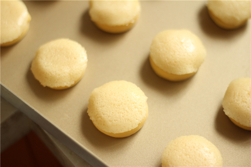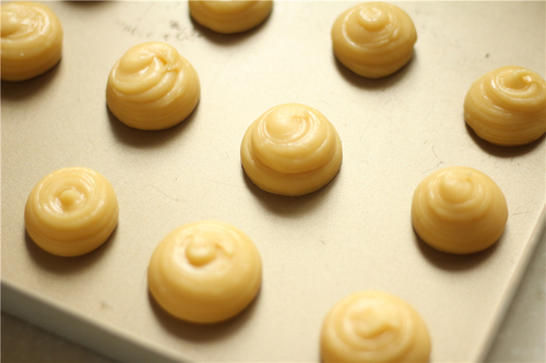 烤箱设置上下烤170度30分钟,开始预热;将做好的面糊装入裱花袋中,在烤盘上挤出大概3cm左右的圆圈;