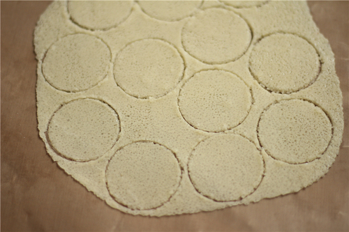 冷藏半小时~1小时左右,待面皮变成适合切割的硬度,取出切成直径大概3cm的圆片,然后继续放入冰箱冷藏备用;