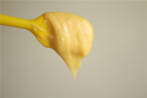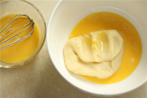 离火,将面团放到另一个碗中,先加入一半调好的蛋液(全蛋+蛋黄),用刮刀完全混合均匀至蛋液被面团吸收后,再加入剩余蛋液的四分之一。注意剩余的蛋液要一点一点加,每次加完都要混合到蛋液完全被面糊吸收,然后检查面糊状态,如果达到提起刮刀面糊能缓慢飘落,落下后在刮刀上形成如图倒三角状时就可以不用再加了,这个状态说明面糊已经ok;