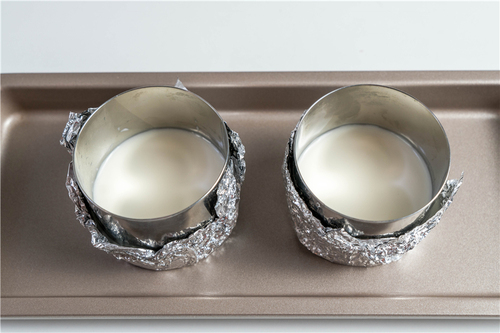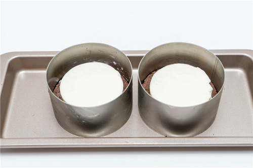 取两个直径为6cm的慕斯圈用锡纸包住,将奶冻混合液倒入并放入冰箱冷藏至凝固,冷藏好后用吹风机或热毛巾脱模;取出第1步准备好的装有蛋糕片的模具,把奶冻放入中央位置,然后冰箱冷藏待用;