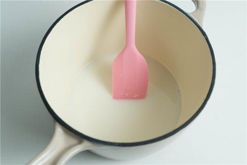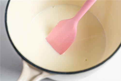 牛奶B、细砂糖B放入锅中,加热至温热状态,放入提前泡好的吉利丁片B,并搅拌均匀;