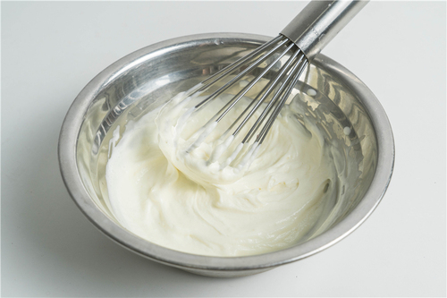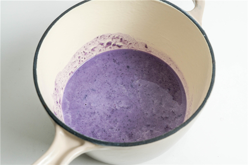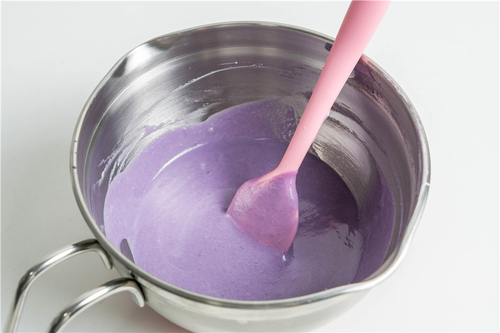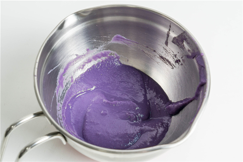 淡奶油B打发至七分发,可划出纹路但还稍微具有一些流动性即可,加入到步骤7中混合均匀,紫薯慕斯液完成;