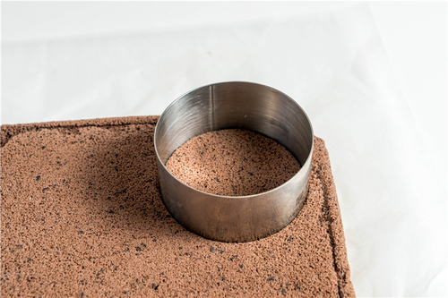 准备一片戚风或者海绵蛋糕,图中是可可戚风蛋糕,可以根据自己的口味来做;用模具切出蛋糕片,接着用锡纸包好慕斯圈,将蛋糕片放入模具底部中间位置;