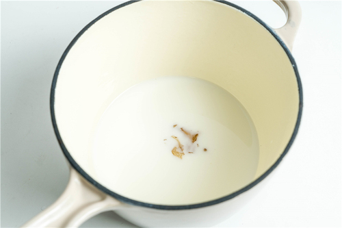 将牛奶A、淡奶油A、细砂糖A放入小锅中,小火加热至温热即可关火,然后将泡软的吉利丁片放入其中混合均匀,奶冻混合液即完成;