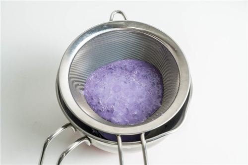将紫薯泥放入步骤6中混合均匀,再将混合物过筛,筛去纤维和颗粒,使得口感更佳细腻(最好过筛两遍,有料理机的可以先用料理机搅打一遍);