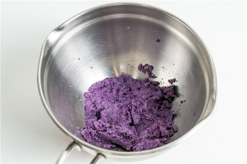 做紫薯慕斯:先将吉利丁片B提前放入冷水中浸泡至软且吸水膨胀;接着将紫薯蒸熟(我蒸熟的紫薯不是那种湿湿的,水分不会很大),可以参考图中状态,如果紫薯偏湿可以稍微减少一些牛奶B的分量),蒸熟后将紫薯碾成泥状;