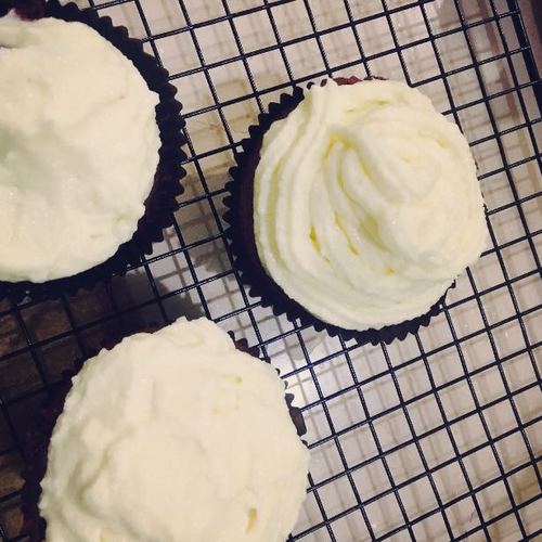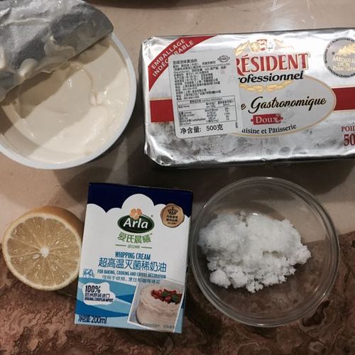 奶油霜我糖加多了有点甜所以我改了一下配方先把软化好的黄油和奶油奶酪加入糖和少许柠檬汁用搅拌机搅拌均匀放到一旁备用第二步将淡奶油打发后加入奶酪糊中搅拌均匀即可放入裱花袋中开始裱花