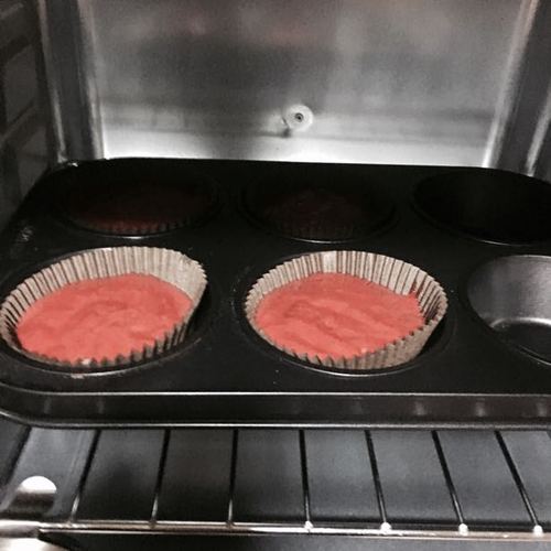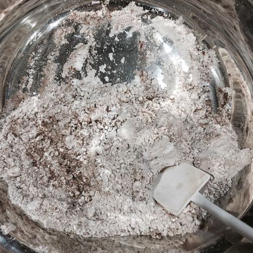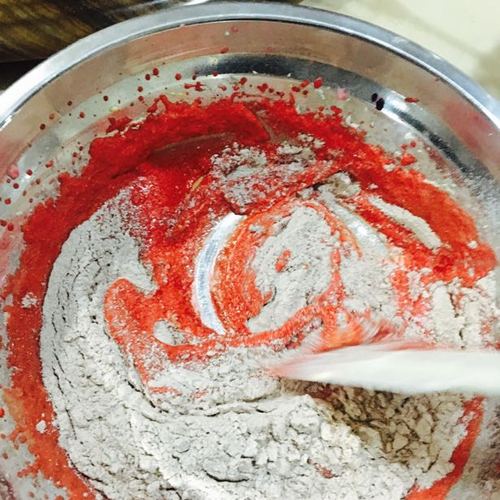 将之前准备的搅拌好的可可粉和低筋面粉筛入黄油糊中再加入之前准备的小苏打、泡打粉、食盐之后再加入香草精和红丝绒食用色素翻拌均匀就可以啦