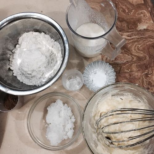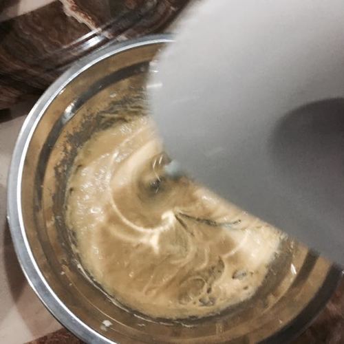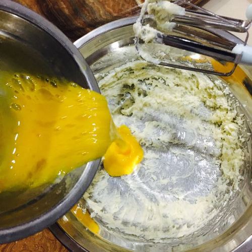 第三步鸡蛋打散分三次加入前面打发好的黄油中然后分三次加入buttermilk搅拌均匀