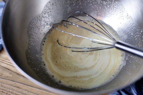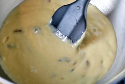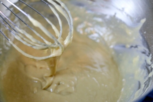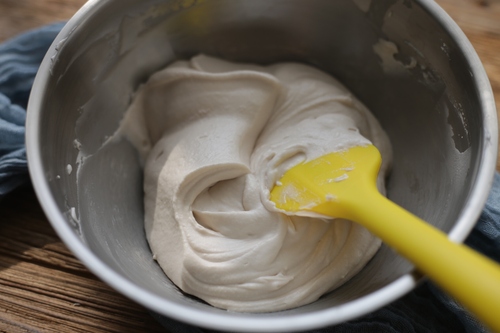 将冷却的黄油奶油混合物倒入料理盆中,用蛋抽混合均匀;