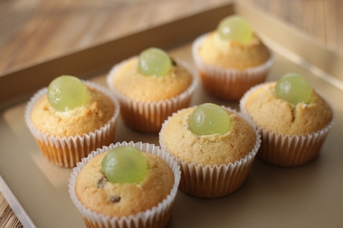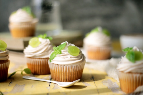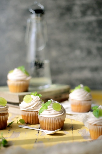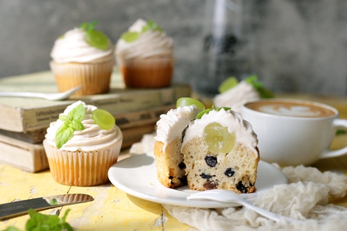 蛋糕用刀子挖一个小坑,把提子填进去;用裱花袋装上星形花嘴,挤上奶酪霜,装饰切半的提子与薄荷叶,完成!