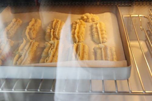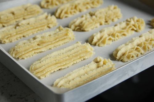 将面糊装入安了曲奇花嘴(花嘴型号SN7092)的裱花袋中,烤盘上放上硅油纸,将面糊均匀地挤在硅油纸上;