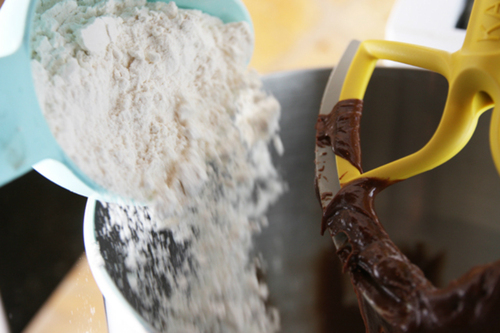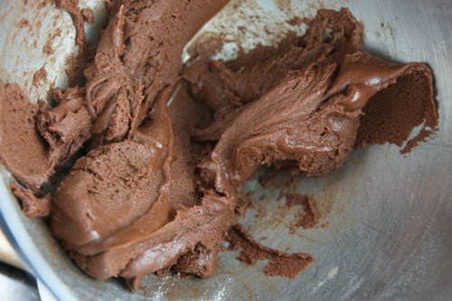 加入3/4杯巧克力酱,软化的黄油,打入鸡蛋,搅拌均匀,直至呈现光滑的奶油感;