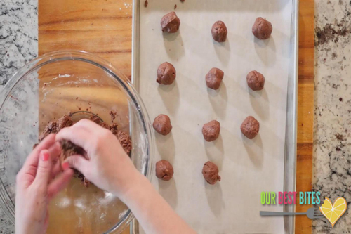 把面团捏成一个个小球,也可以用勺子辅助,每隔2英寸(约5cm)放置于烤盘上;