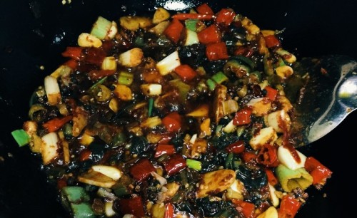 调料炒出香味以后,放入豆瓣酱再次炒香(炒出红油,就是油跟豆瓣酱融合变红)