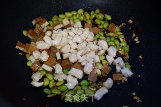 香干洗净,切成1cm的方粒。熟毛豆仁备好。